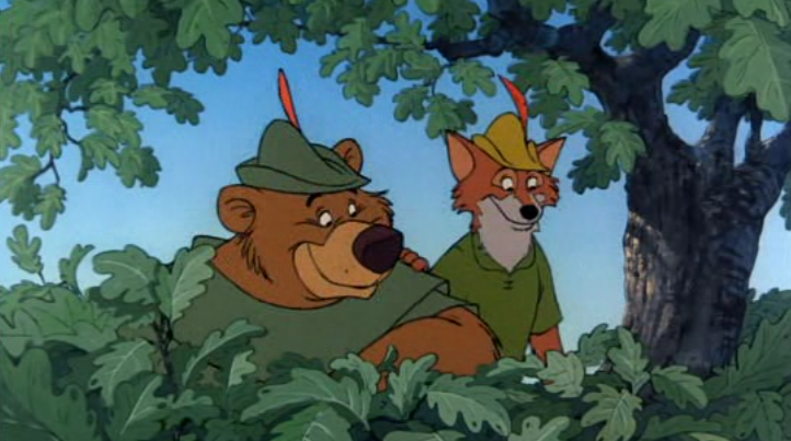 Still going with visuals, a lot of the animation, while still fluid, seems a bit lazy compared to films past. Combine that with the film's penchant for re-using animation at times, the most egregious example being a dance scene with all the woodland critters, with obvious dance sequence lifts from 'Snow White' and 'The Aristocats.' That's right, they borrowed footage from their LAST MOVIE. There's also some stuff from 'The Jungle Book' that's rather obvious, and it doesn't help that Little John not only has a similar character and design as Baloo, but has the same voice actor.